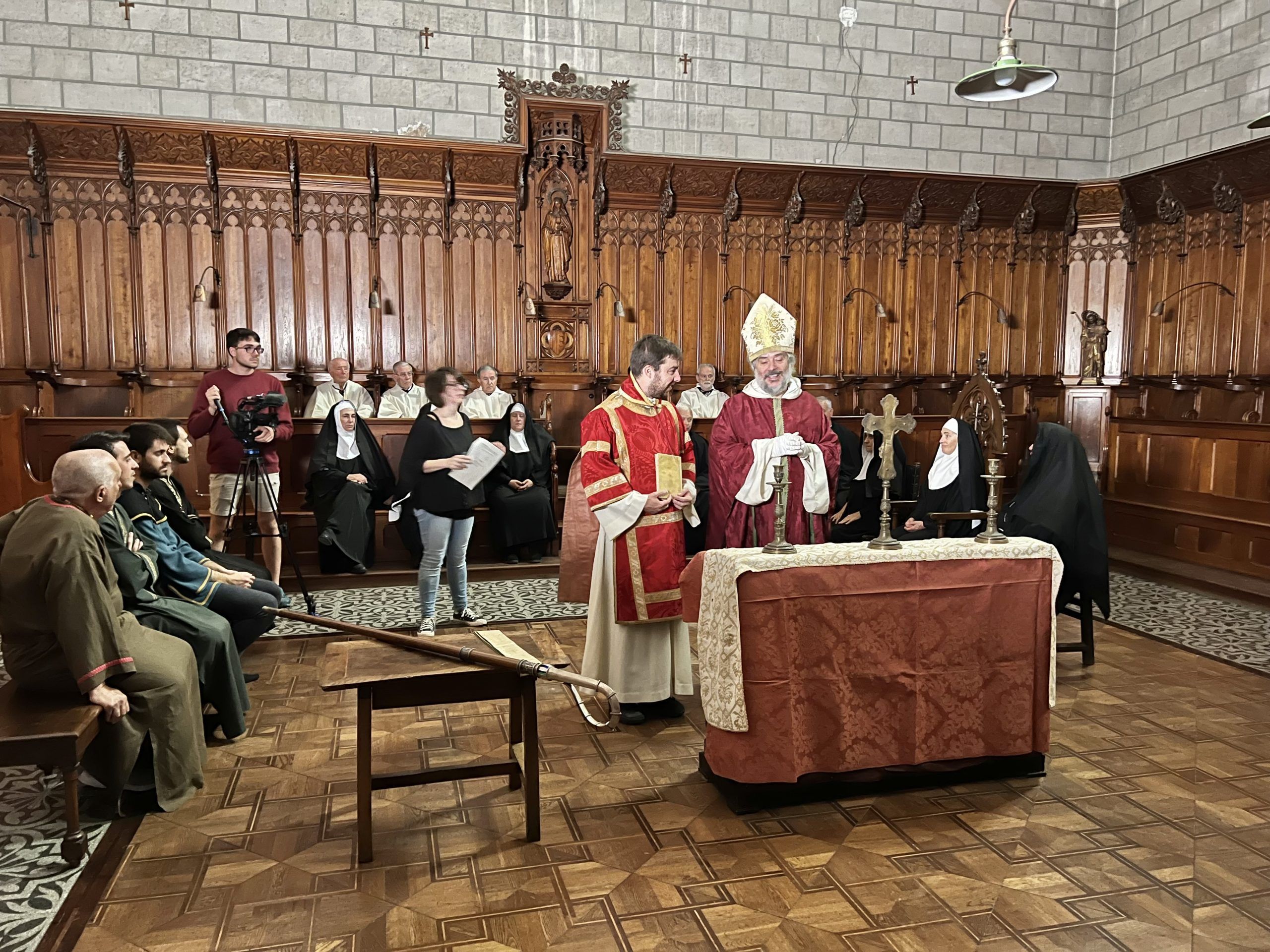 Una proposta que ens apropat a les persones, càrrecs i espais que intervenien en aquests rituals, al seu gest i significat, així com als elements materials i immaterials emprats (robes, objectes, cants, silencis…). I que ha suposat la coordinació de més de vint figurants voluntaris (membres del projecte, professorat i alumnat de la Universitat de Barcelona i col·laboradors de l’ACUB), dues formacions corals especialitzades en cant gregorià (Auditexaudi y Schola Gregoriana de Catalunya) i la col·laboració de les comunitats de Sant Benet de Montserrat i Sant Pere de les Puel·les de Barcelona, així com del Museu Reial Monestir de Santa Maria de Pedralbes, en l’attrezo (vestimenta, objectes i mobiliari) i els espais.